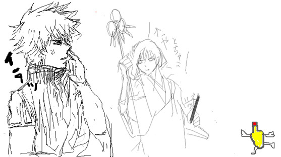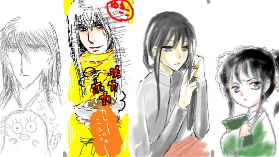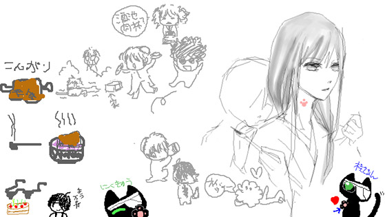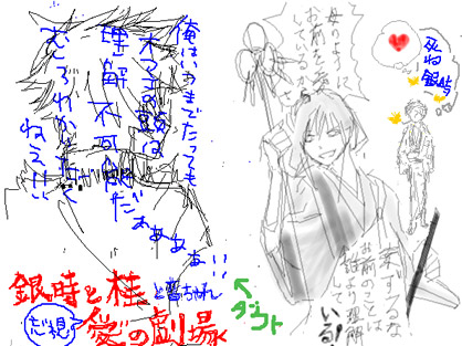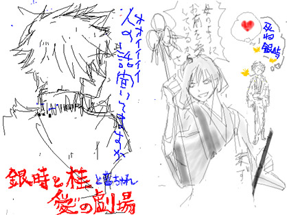 午前2時のちょっとまえくらい。残りのお三方がまだちょっとだいじょうぶと云うことで。なにをしましょう、みなの桂が見たい、とのやりとりがあって、振り分けて描くことに。題材は、桂、子桂(攘夷でも可)、3Z桂、変装桂(変装ならなんでも可)。