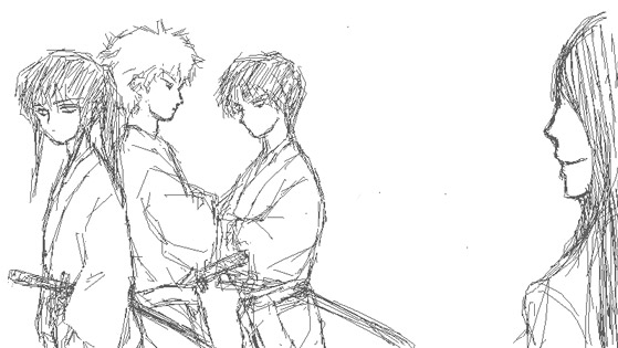 線画に終始したかるの銀桂晋は、参戦直前のころのイメージ。銀桂が15歳くらい。晋がそのちょっと下なんだけどそれを忘れて描いてた(笑) 右はそれに合わせて加えてくださったゆきこさんの松陽先生。
